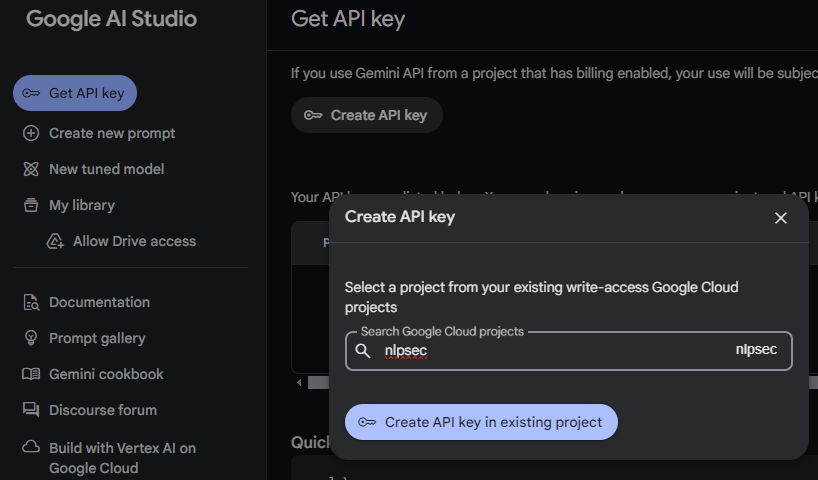 API keys that are in the pay-as-you-go tier need to be set up via Google's AI Studio at https://aistudio.google.com. From Google's AI Studio import your cloud project and create an API key using the project. We will utilize this key within AI Studio when building applications that require access to models.
