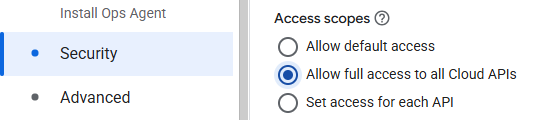 Go back to your Compute Engine configuration. Another way to restrict the VM's access is to use the "Access scopes" mechanism shown in the UI. Access scopes allow one to specify which Google Cloud APIs the VM has permissions to use. Hover over the question mark next to "Access scopes".