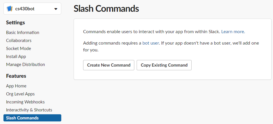 Go back to your Slack App configuration page. Go to "Slash Commands" and click on "Create New Command".