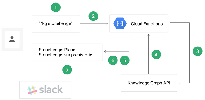 In this lab, we will create a custom Slack command that queries Google's Knowledge Graph API on demand through the use of Cloud Functions. The flow is shown below.