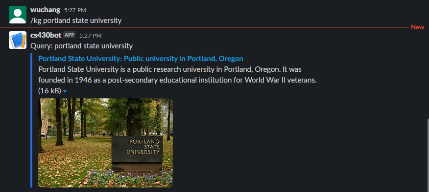 Upon receiving a response from the Knowledge Graph API, it is formatted using the function format_slack_message() in order to pass it back to the Slack workspace.