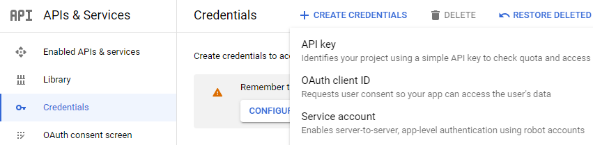 Visit the "Credentials" subsection of "APIs & Services" and create a new "API key" credential:
