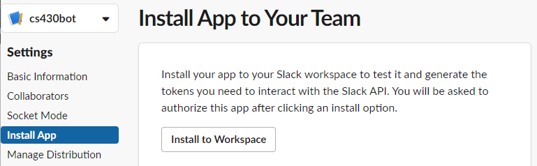 Install the App into your workspace, granting its permissions to perform actions on it: