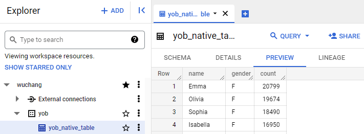 Create the table. Click on the table created within the dataset, then click the "Preview" tab to validate that the table has been created properly.
