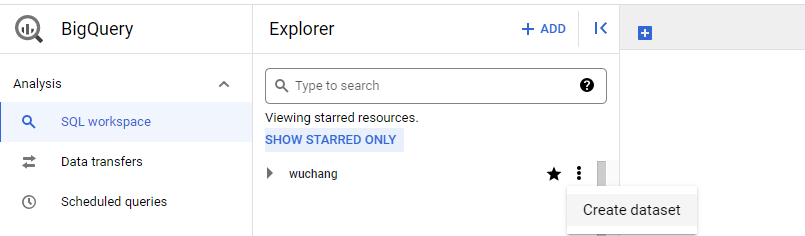 Go to the web console and visit BigQuery. In the explorer window, select your project and then "Create dataset".