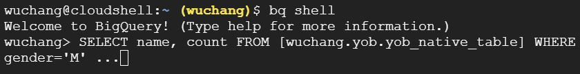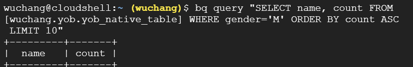 bq commandBigQuery can also be queried from Cloud Shell using the SDK's bq command. Bring up a Cloud Shell session and run a query to get the 10 least popular boys names in 2014. Note that the tool requires the table name to be delimited by square brackets with the colon and period separating the project name, dataset name, and table name as shown below.