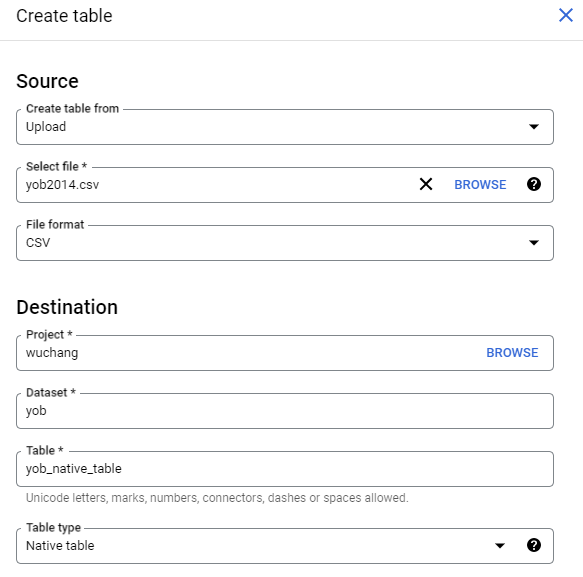 We will be creating a table by uploading the CSV file we previously retrieved from the course web site. Specify this, then locate the CSV file you previously downloaded, and select the CSV format (comma-separated values). Under "Destination", name the table yob_native_table.
