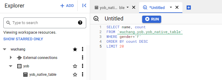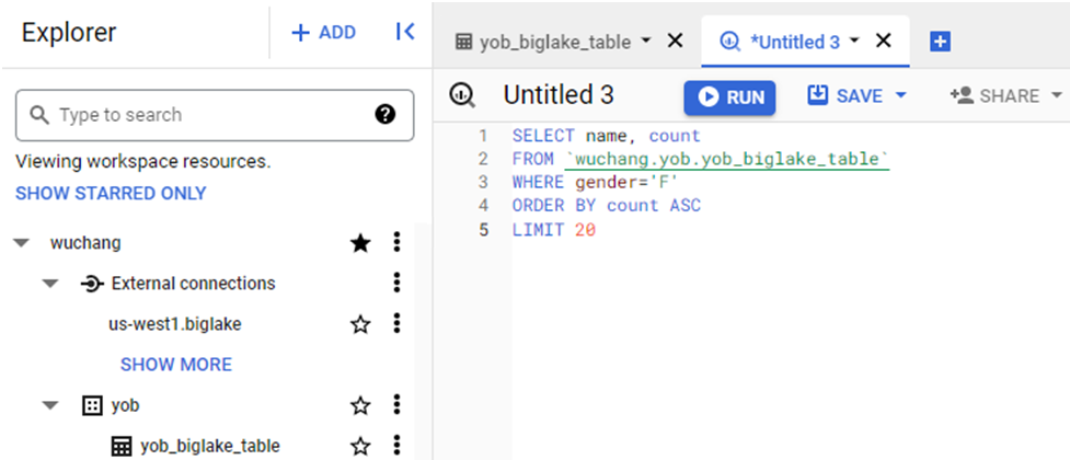 We will now query the external table as done before with the native table. Select the external table and compose a query that lists the 20 least popular female names in 2014.