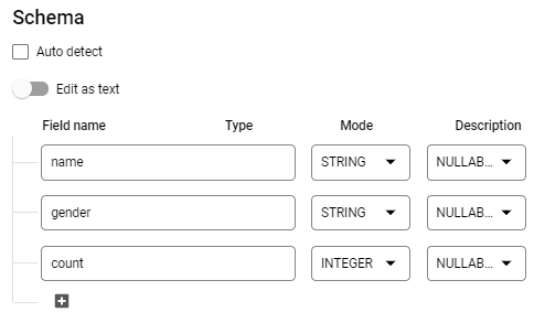 Then, under "Schema", add fields that correspond to the columns in the file including their types (in this case string or integer).