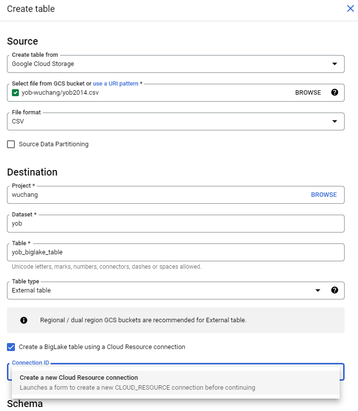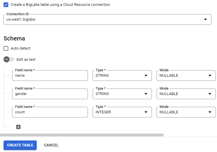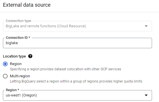In configuring this external data source, specify a Connection ID of biglake and the region as us-west1 (where the storage bucket is located), then create the connection.