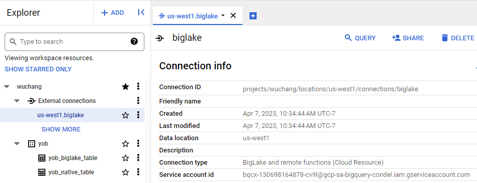 Go back to BigQuery and find the biglake connection we have just created under the project's "External connections" as shown below. Select the connection and find the service account associated with it.