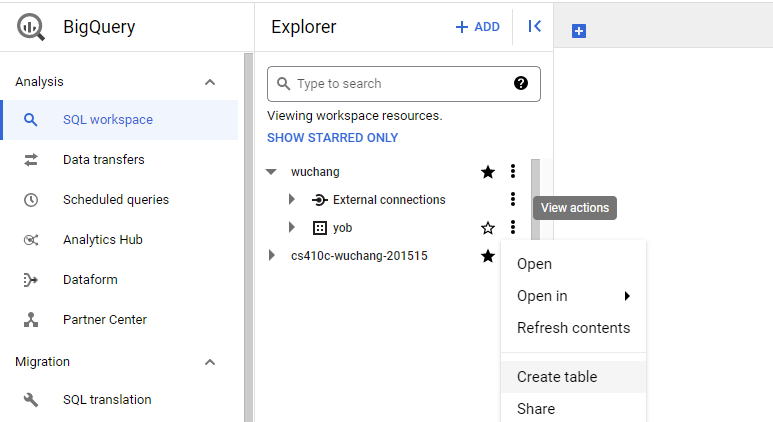 Give the dataset an ID of yob and specify its region as us-west1. Back in the console, expand out the project to show the dataset. Use the dropdown menu to create a table within the dataset.