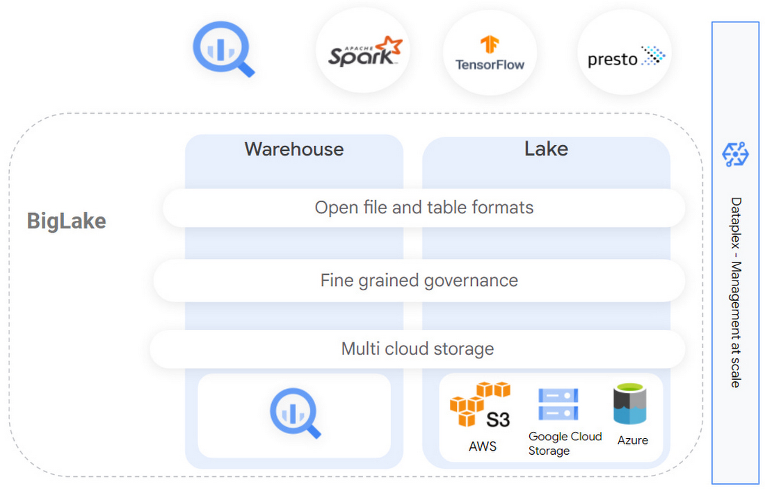 The prior lab creates a table within the BigQuery data warehouse by extracting data from a file that is uploaded and importing it into BigQuery's storage layer (e.g. the left half of the above figure). This results in two copies of the data: within the CSV and within the warehouse. The data lake approach takes an alternate approach in which data is kept in its original location and format with the extraction being done as queries access the data (e.g. the right half of the above figure). As both modes of operation are supported on the platform, we'll repeat the steps from the prior lab, but utilize a data lake approach for creating tables and performing queries on the data.