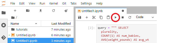 Then, in a single cell, enter in code that imports the BigQuery Python package, creates a BigQuery client, issues the query, obtains the response as a Pandas data frame, and outputs the first three results (e.g. single, twins, and triplets). Click on the play button to execute the code.