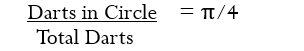 When one randomly throws darts into the square, the ratio of the darts in the circle to the total number of darts thrown should be the ratio of the areas or π/4.