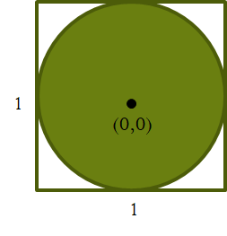 Consider a square with sides of length 1 and area 1, centered around the origin of an x-y graph. A circle drawn within it will have diameter 1 and radius ½. The area of the circle will then be π*(½)2 or π/4.