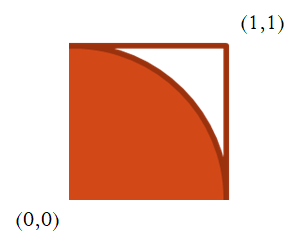 A Python version of the code is shown below. The function inside() randomly picks two values for x and y uniformly between 0 and 1 and checks whether the point resides within the unit circle (orange area).