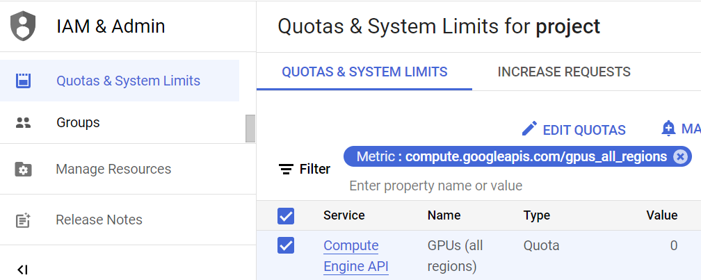 By default, GCP projects have quotas on resources that disable GPU usage. Visit the Google Cloud Platform console and then navigate to the IAM part of the platform "Quotas and System Limits" section of IAM. A direct link to it is here. Filter on "gpus_all_regions" and edit the quota to request a change to "1". It will ask you to submit a quota request. Follow the steps and you will receive an email. The email will say it will take up to 2 business days to process your request, but you should receive a follow up email within a few minutes. We'll be using an NVIDIA T4 GPU. Check that its quota is set to "1" by searching for "nvidia_t4_gpus"