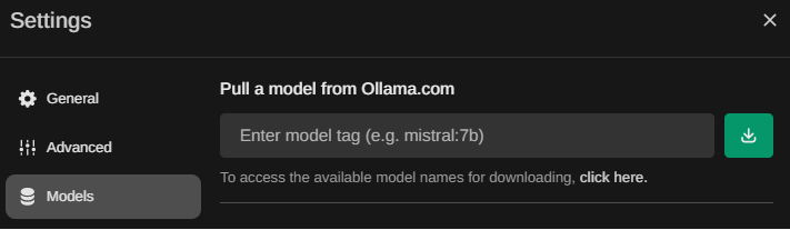 Then, visit the "Models" section which provides an interface to pull models available from ollama.com.
