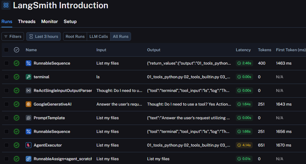 Enter in a query. Then, after execution, navigate to the LangSmith projects tab in the UI, and the project "LangSmith Introduction" should appear in the projects list. Select the project and examine the execution logs for the query. Navigate the interface to see the trace information it has collected. Such information will be useful as you build your own agents.