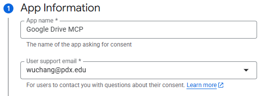 If this is the first time OAuth is being configured, you will be asked to specify application information. Name the application "Google Drive MCP" and utilize your pdx.edu address.