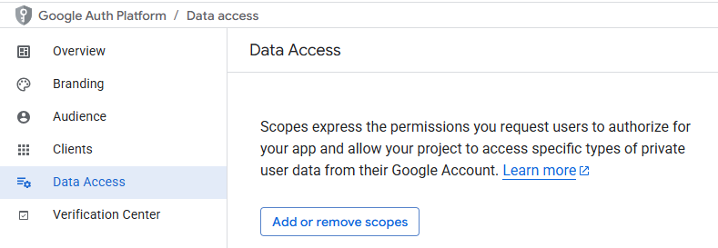 Configure the Audience to "Internal" and set the contact information to your pdx.edu address. Agree to the user data policy and create the project configuration. Navigate to the "Data Access" portion of the console shown below and click on "Add or remove scopes"