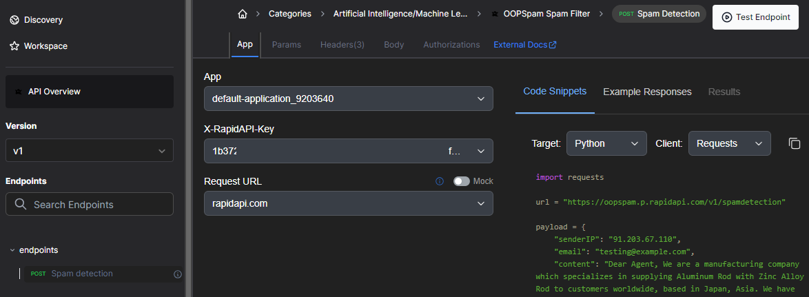 Another common area for threat intelligence is e-mail addresses and payloads. In this exercise, three sources of Email intelligence are integrated as tools using an agent. The first is from the OOPSpam Spam Filter. Login to Rapid API and visit the playground for the service (https://rapidapi.com/oopspam/api/oopspam-spam-filter) Test the endpoint with the default payload given.