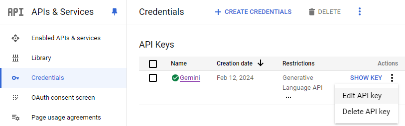 Then, navigate to your project's API credentials page at https://console.cloud.google.com/apis/credentials. Find the API you've set up previously, then edit the key.