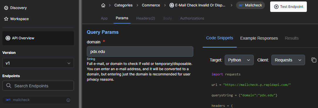 Obtaining information about particular DNS names can also be helpful in responding to potential attacks. In this exercise, three sources of Domain Name System intelligence are integrated as tools using an agent. The first is from the mailcheck service set up previously via Rapid APIs. Login to Rapid API and visit the playground for the service (https://rapidapi.com/Top-Rated/api/e-mail-check-invalid-or-disposable-domain) Click on the "Params" tab and test the endpoint with a DNS name of your choice.