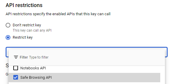 Within the API restrictions for the key, scroll down and add Safe Browsing to the APIs allowed. Then, click on "Save" to persist the changes.