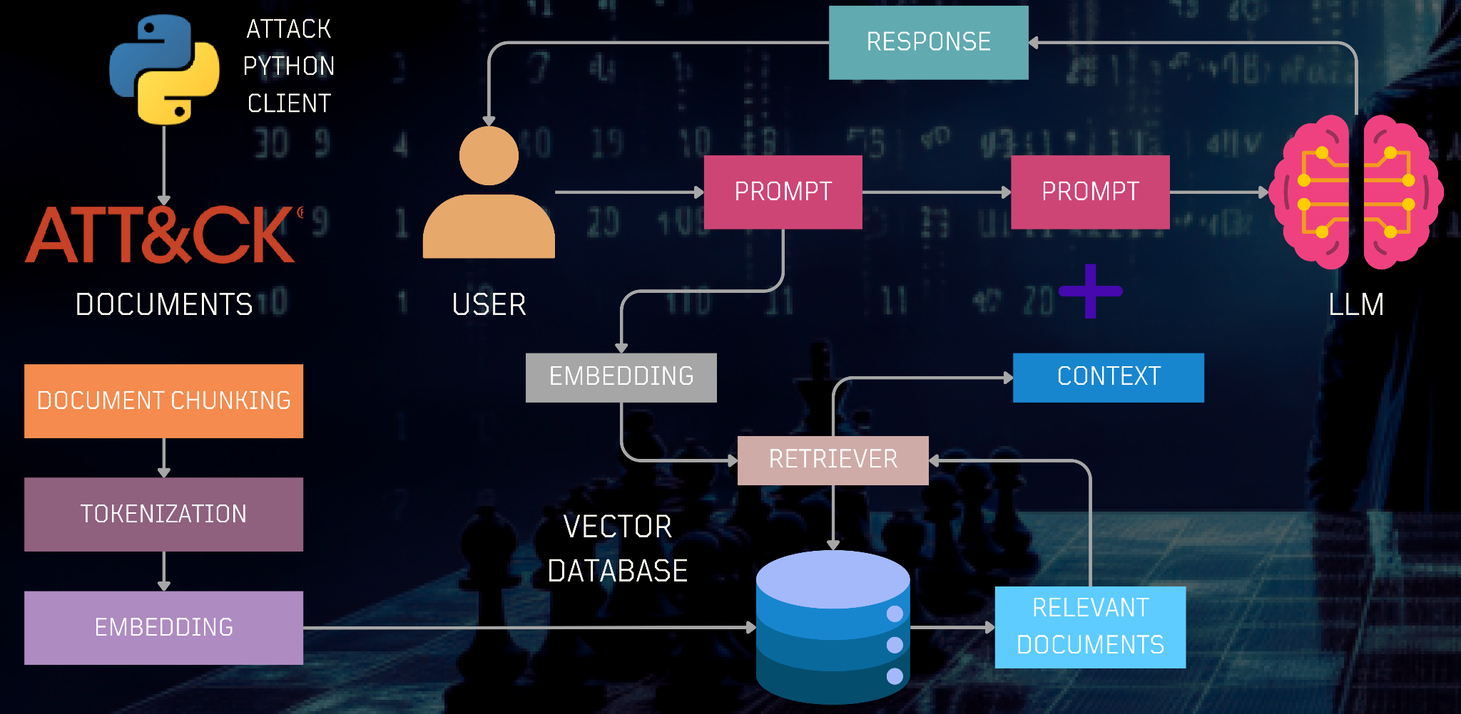 In this exercise, we'll examine an application of retrieval-augmented generation towards the problem of threat intelligence. The Trusted Automated Exchange of Intelligence Information (TAXII™) is an application protocol for exchanging cyber-threat intelligence (CTI) over HTTPS. An example of a production RAG application is shown below from the Open Threat Research Forge's GenAI Security Adventures repository. In the application, CTI documents from Mitre Att&ck's repository are downloaded, chunked, and tokenized before being embedded and inserted into a vector database. The application then allows a user to query the data via a prompt that is used to retrieve the relevant document. The prompt and document are then sent to the LLM to answer the user's query.