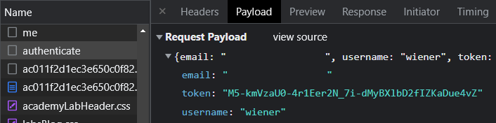 Rather than use the information we obtain from this request for the subsequent request to the client application's /authenticate end-point. We substitute carlos's e-mail address instead and solve the level.