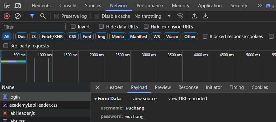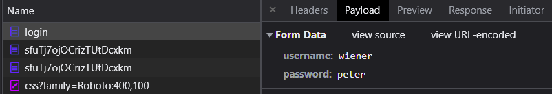 action attribute of the form?With the Developer Tools still up, log in using the credentials given to you and view the network requests that are generated. Click on the form submission request and then on the "Payload" tab to see the credentials being sent.