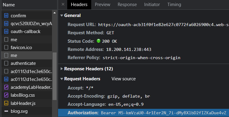 With the Developer Tools still up, click "Continue" and view the network requests. The confirmation page completes the authorization step and redirects the user to a page on the identity provider's site which will redirect the user back to the client application's callback URL with an authorization token attached. Click on this request to find the redirection that includes the token.