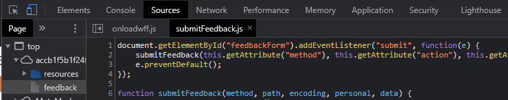 Below the form, a Javascript file has been included that handles the feedback submission function. Bring this file up in the Sources tab of Developer Tools and examine its source code. The first part of the script registers an event listener for when the button to submit the form has been pressed. The listener invokes the submitFeedback() function that follows it.