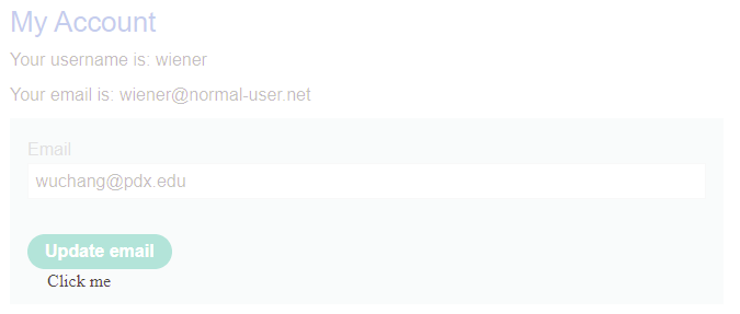 Begin by logging in with the given credentials on the lab site. Then, visit the "My account" page to view its e-mail change form. Then, using the prior level's exploit script, change its formAction to "STORE" and upload the prior level's solution to the exploit server. Then visit the exploit server and "View exploit". Note that the transparent <iframe> contains the form, but doesn't have an address filled in. Even if we properly aligned the "Click me" and "Update email" buttons, nothing would happen when the victim clicks.