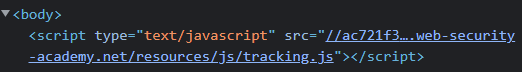 We can now perform the exploit. As before, we're given an exploit site to host our malicious tracking script. We'll place the code 'alert(document.cookie)' at https://{exploit_site}/resources/js/tracking.js.
