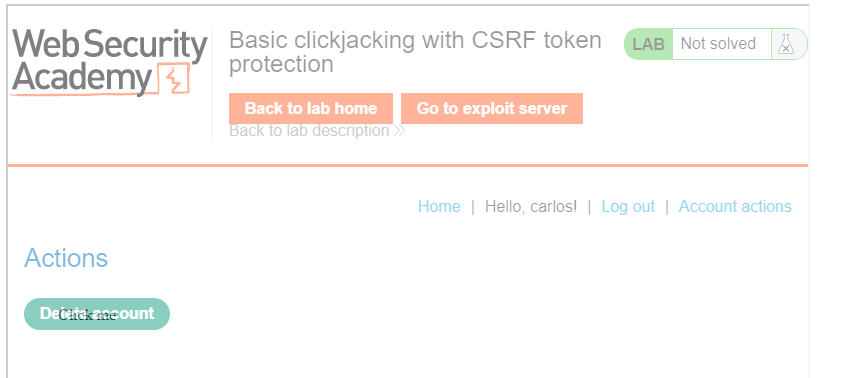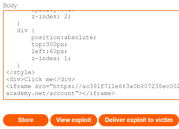 It constructs a style for the <iframe> with particular dimensions and a low opacity. This will load the vulnerable page up so we can faintly see it in the background. In a real attack, the opacity would be set to something much smaller to make the vulnerable page completely invisible to the victim. It then constructs a style for the <div> that places the element in a particular location in order to cause the content of the <div> to fall right on top of the "Delete account" element of the underlying <iframe> from the vulnerable site. The CSS is followed by the HTML which instantiates the content. Fill it in based on the URL of the page that contains the "Delete account" button. The HTML instantiates the text "Click me" that will appear right over the "Delete account" of the <iframe>. Go to the exploit server for the lab and paste in your exploit after filling in the URL in the <iframe>.