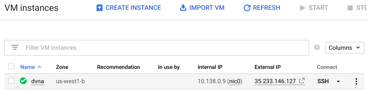 When the VM comes up, note its "External IP" address, then click on "SSH" to log into it.