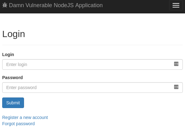 dvna".sudo docker run -di -p 80:9090 --name dvna appsecco/dvna:sqlite