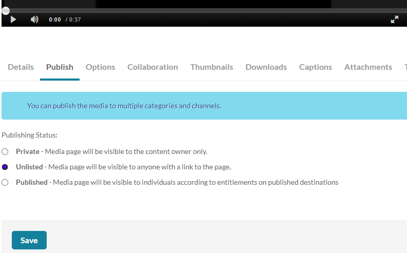 After selecting and uploading the video, you will then bring the video up on Media Space, select the "Publish" tab, click on "Unlisted", and then "Save".
