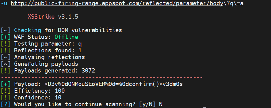 python3 xsstrike.py -u "http://<wfp1_internal_IP>/xss/example1.php?name=hacker"