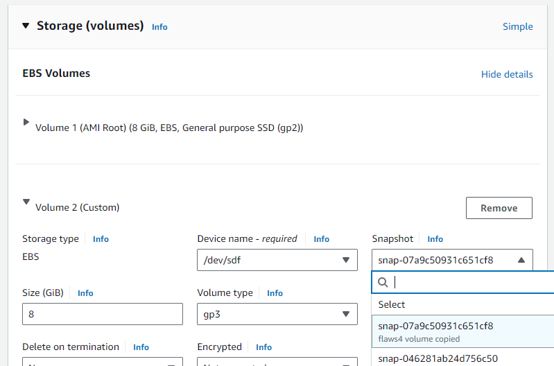 Then, within the EC2 console, launch a Ubuntu instance on a t2.micro instance in us-east-1 (N. Virginia). When configuring storage, click on the advanced settings to add a new volume via a snapshot. Search for the SnapshotId, and add it using device /dev/sdf.