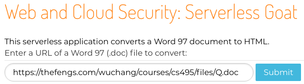 The vulnerable application (courtesy of Yuri Shapira, Ory Segal, and PureSec) ​can be found at http://sg.oregonctf.org . The serverless application takes a URL that specifies a Word 97 document and converts it into HTML to return it.