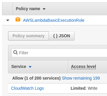 It turns out there are several roles attached to the Lambda you're accessing. As an adversary, you wouldn't typically have access to list them, but you would instead infer them by trial and error. The first role is the standard Lambda execution role that allows the Lambda to write to the CloudWatch service which serves as the project's centralized logging facility. Allowing a role to write to the log service is standard practice as allowing read access would enable it to access log entries of other services that it should not need.