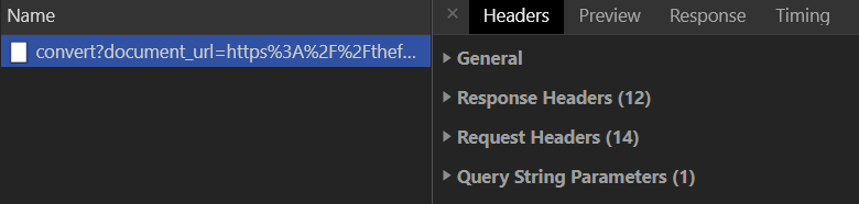 You can pull out the HTTP request and response headers for the main conversion request, by clicking on it and then on "Headers". Then, submit a document to be converted. The request should appear in Developer Tools. Clicking on it will give you the data that corresponds to this request including the General, Response Headers, Request Headers, and Query String Parameters.