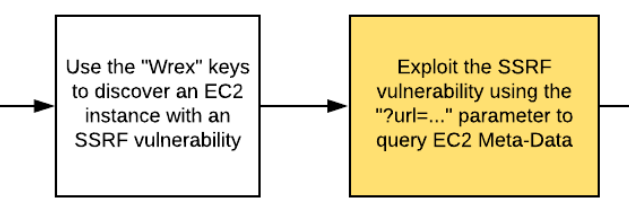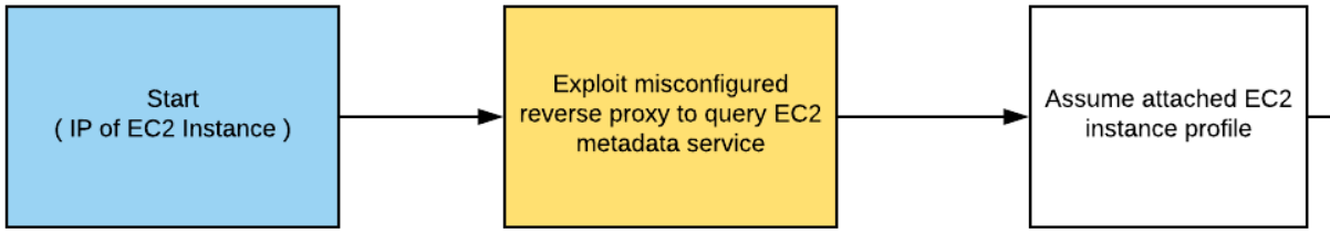 We start with the proxy and initiate a server-side request forgery that allows us to use the proxy to pivot over to the Metadata service for the EC2 instance. Given the credentials we find on the Metadata service, we then assume the role associated with the EC2 instance hosting the proxy.