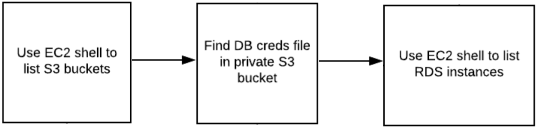 From here, we'll take a peak at the EC2 Metadata service to reveal all of the information the EC2 instance needs to access the backend database for the service. One could use this information to access the database and finish the level, but we'll solve it a more convoluted way for fun! Returning back to the instance, we will leverage the shell to list the S3 buckets the instance has access to and find the file in the bucket that contains the same backend database credentials found in the Metadata. Use the AWS CLI to list the RDS instances available to discover the location of the backend database.
