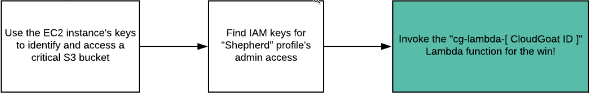 The Metadata service exposes the EC2 instance's keys which you can then use to obtain access to a storage bucket that contains IAM keys for an administrator. Using these credentials, you will invoke a restricted Lambda function.