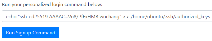 Specifically, the command we wish to run in the "Run Signup Command" UI to append the public key (foo.pub) to the web site's authorized_keys is: